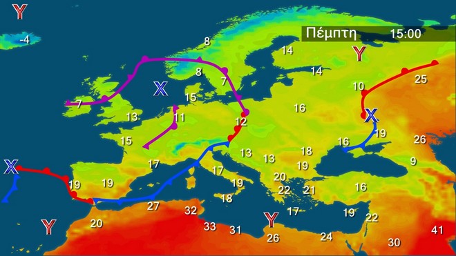 Στον γενικό χάρτη της Ευρώπης φαίνεται χαρακτηριστικά το ισχυρό βαρομετρικό χαμηλό που επηρεάζει τη βορειοδυτική Ευρώπη ενώ προς την περιοχή μας επεκτείνεται το πεδίο υψηλών πιέσεων της κεντρικής Μεσογείου. Οι θερμοκρασίες σε όλη την ηπειρωτική Ευρώπη κυμαίνονται σε επίπεδα κάτω από τα κανονικά.