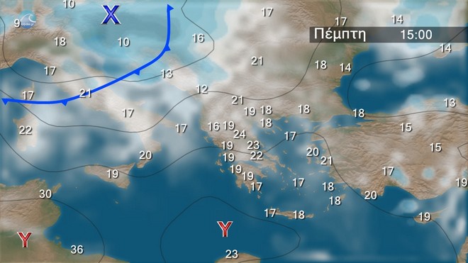 Στον χάρτη της Βαλκανικής που ακολουθεί παρατηρούμε ότι ο καιρός θα είναι βελτιωμένος στη χώρα μας, ενώ το βαρομετρικό χαμηλό που βρίσκεται στα βορειοδυτικά Βαλκάνια θα προκαλέσει μεταβολή του καιρού στα βόρεια. Οι άνεμοι θα πνέουν στα νότια από δυτικές διευθύνσεις 3 με 5 και βαθμιαία τοπικά 6 μποφόρ, ενώ στην υπόλοιπη χώρα θα πνέουν από νότιες διευθύνσεις με την ίδια ένταση. Η θερμοκρασία θα φτάσει τους 21 βαθμούς, στα βόρεια στα υπόλοιπα ηπειρωτικά τους 20 με 22 βαθμούς και στα νησιά του Αιγαίου τους 23 βαθμούς Κελσίου.