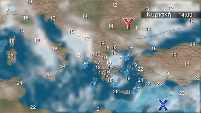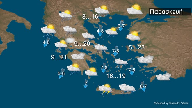 βροχές στην ανατολική Στερεά, την Εύβοια, τις Κυκλάδες και την Κρήτη, οι οποίες στη βόρεια Κρήτη θα έχουν μεγαλύτερη ένταση και διάρκεια. Λίγα χιόνια θα πέσουν στα ορεινά της ανατολικής Στερεάς με μεγάλο υψόμετρο. Οι άνεμοι θα πνέουν βορειοανατολικοί 4 με 6, στα δυτικά 5 με 7 και στο Αιγαίο 8 μποφόρ. Η θερμοκρασία δεν θα σημειώσει αξιόλογη μεταβολή.