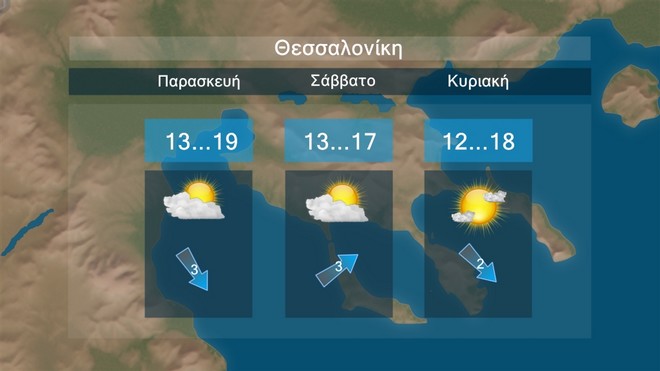 Στα ανατολικά και τα νότια νεφώσεις παροδικά αυξημένες, με τοπικές βροχές στη βόρεια Κρήτη. Στην υπόλοιπη χώρα γενικά αίθριος καιρός. Οι άνεμοι θα πνέουν βόρειοι βορειοανατολικοί, στα δυτικά ασθενείς, στα ανατολικά 3 με 5 και τοπικά στο Αιγαίο 6 μποφόρ. Η θερμοκρασία θα σημειώσει μικρή άνοδο ως προς τις μέγιστες τιμές, στο Ιόνιο και τα ηπειρωτικά.