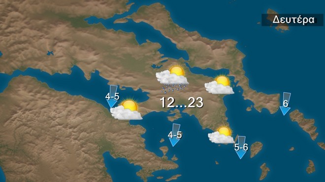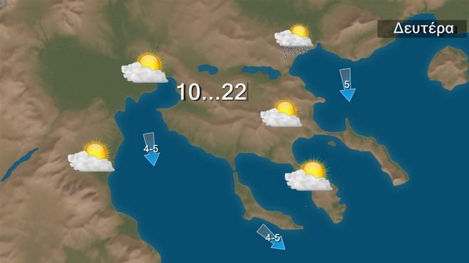 Τη Δευτέρα στα ανατολικά και τα νότια προβλέπονται νεφώσεις με τοπικές βροχές, ενώ σποραδικές καταιγίδες είναι πιθανόν να εκδηλωθούν κυρίως στη νότια νησιωτική χώρα. Στις υπόλοιπες περιοχές θα υπάρχουν λίγες νεφώσεις παροδικά αυξημένες. Οι άνεμοι θα πνέουν βόρειοι βορειοανατολικοί, στα δυτικά 3 με 5, στα ανατολικά 4 με 6 μποφόρ με τάση ενίσχυσης το βράδυ στο Αιγαίο. Η θερμοκρασία θα σημειώσει μικρή πτώση και θα έχει μέγιστη τιμή στα βόρεια τους 22 βαθμούς, στα υπόλοιπα ηπειρωτικά και το Ιόνιο τους 23 με 24 βαθμούς Κελσίου, στις Κυκλάδες και την Κρήτη τους 24 βαθμούς και στο Ανατολικό Αιγαίο και τα Δωδεκάνησα τους 25 βαθμούς Κελσίου.