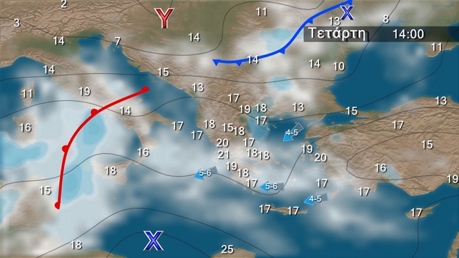 Από την Τετάρτη θα εκδηλωθούν τοπικές βροχές στα βόρεια και θα έχουμε μικρή πτώση της θερμοκρασίας. Την Πέμπτη και την Παρασκευή θα βρέξει τοπικά στα ανατολικά ηπειρωτικά τις Κυκλάδες και την Κρήτη με σταδιακή βελτίωση από την Παρασκευή το μεσημέρι. Η θερμοκρασία θα πέσει κι άλλο γιατί θα επικρατήσουν βορειανατολικοί άνεμοι 6 με 7 και τοπικά 8 μπ στο Αιγαίο.