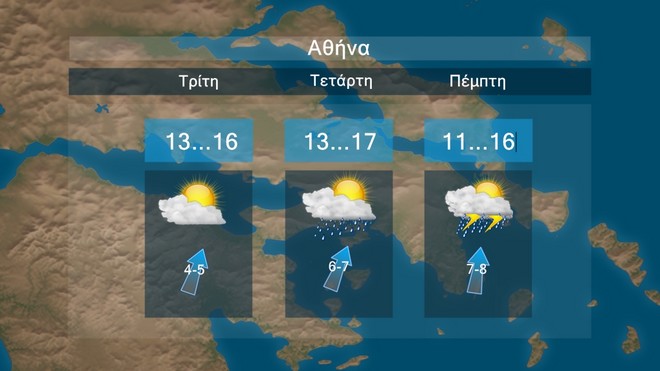 Στην Αθήνα προβλέπονται παροδικές νεφώσεις με βροχές και καταιγίδες την Τετάρτη και Πέμπτη . Η θερμοκρασία θα κυμαίνεται μεταξύ 16 και 17 βαθμών Κελσίου