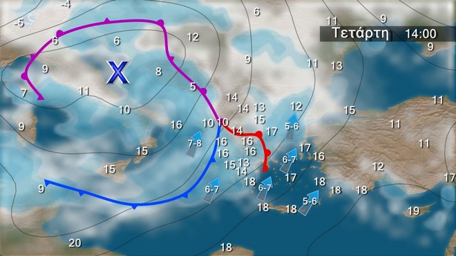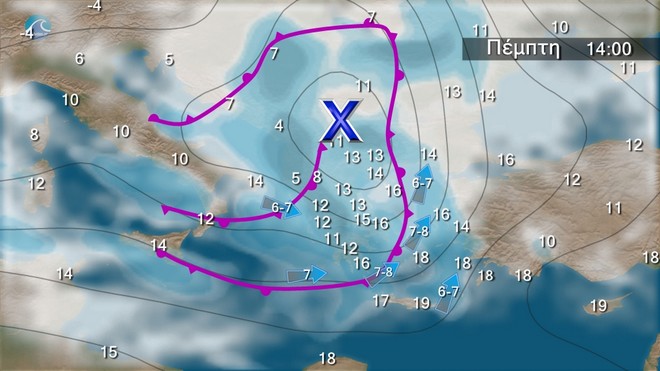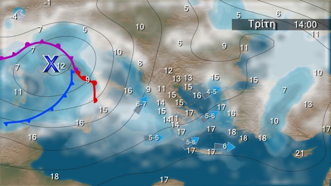 Κακοκαιρία θα επηρεάσει από τα δυτικά το μεγαλύτερο μέρος της χώρας με βροχές και καταιγίδες, πιθανώς κατά τόπους ισχυρές, κυρίως στα δυτικά και τα νησιά του ανατολικού Αιγαίου. Χιονοπτώσεις θα σημειωθούν στα κεντρικά και βόρεια ορεινά της ηπειρωτικής χώρας. Σταδιακή εξασθένηση των φαινομένων προβλέπεται από τις βραδινές ώρες στα δυτικά. Οι άνεμοι θα πνέουν από νότιες διευθύνσεις 5 με 7 και στο Αιγαίο τοπικά 8 μποφόρ. Από το απόγευμα και από τα δυτικά βαθμιαία θα στραφούν σε δυτικούς και θα εξασθενήσουν. Η θερμοκρασία θα σημειώσει μικρή πτώση στα δυτικά, τα κεντρικά και τα βόρεια.