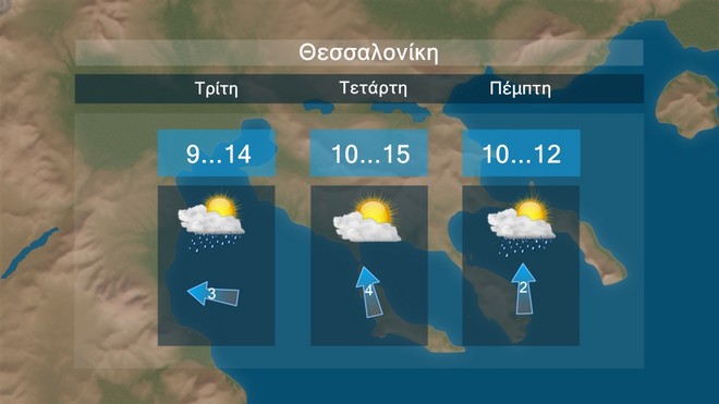 Στην ανατολική Μακεδονία και τη Θράκη, προβλέπονται νεφώσεις με βροχές, χιονοπτώσεις στα ορεινά και τις πρώτες πρωινές ώρες σποραδικές καταιγίδες, γρήγορα όμως ο καιρός θα βελτιωθεί. Στα δυτικά, τα νησιά του Αιγαίου, τα Δωδεκάνησα και την Κρήτη παροδικά αυξημένες νεφώσεις με τοπικές βροχές και κυρίως στα νησιά του Ιονίου και τα Δωδεκάνησα σποραδικές καταιγίδες. Τα φαινόμενα από αργά το βράδυ στα δυτικά θα ενταθούν. Στην υπόλοιπη χώρα γενικά βελτιωμένος καιρός, με τοπικές νεφώσεις από τις βραδινές ώρες. Οι άνεμοι θα πνέουν δυτικοί νοτιοδυτικοί 4 με 5 μποφόρ. Από το απόγευμα στο Ιόνιο θα στραφούν σε νότιους νοτιοδυτικούς και θα ενισχυθούν σε 6 με 7 μποφόρ. Η θερμοκρασία δεν θα σημειώσει αξιόλογη μεταβολή.