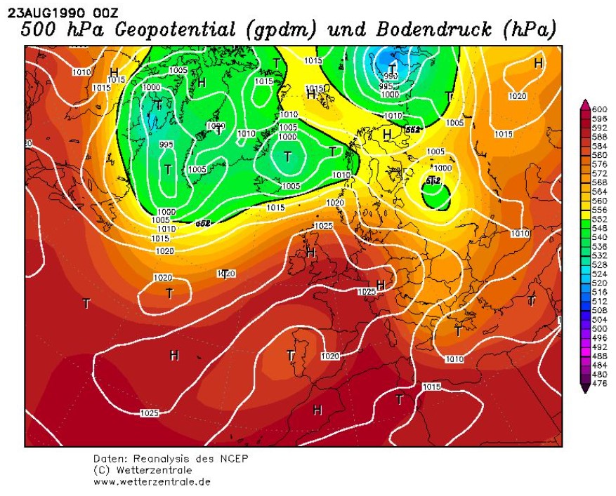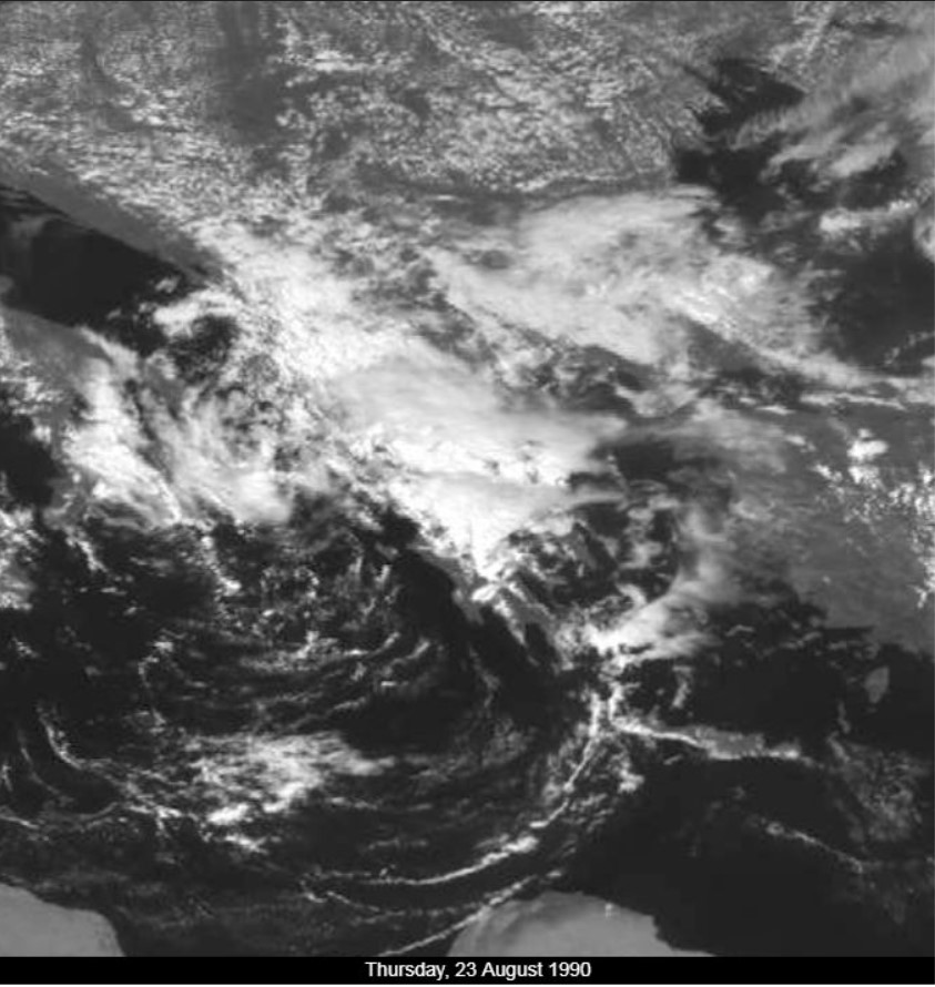 Από μετεωρολογικής άποψης τότε ήρθε μια μεγάλη διαταραχή από τα βορειοδυτικά, που προκάλεσε πολύ έντονα φαινόμενα, για την οποία χαρακτηριστικά σημειώνω στο προσωπικό μου ημερολόγιο: “H διαταραχή (trough) που ήρθε από τα δυτικά συνοδεύτηκε από πολύ ψυχρή μάζα στα 500 hPa, με -18 βαθμούς και οι καταιγίδες άρχισαν να εκδηλώνονται τη νύχτα της 22/8 στα βόρεια. Στην πρόγνωση αναφέραμε για έντονα φαινόμενα , ενω κατά τη διάρκεια δεν βγήκε κάποιο επιπλέον δελτίο. Στην Αθήνα η καταιγίδα κράτησε 5 ώρες από 23/2000 εως τις 240100 και έπεσαν στη Λάρισα 60 mm βροχής (32+28), στη Λαμία 76, στο Βέλο Κορινθίας 86 και στη Τανάγρα 89 mm βροχής”. Οι καταιγίδες επηρέαζαν ήδη από τις πρωινές ώρες την Κεντρική Ελλάδα και αυτό φαίνεται στα μετεωρολογικά δεδομένα που επικρατούσαν για παράδειγμα στη Λάρισα”.