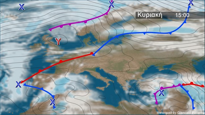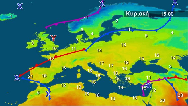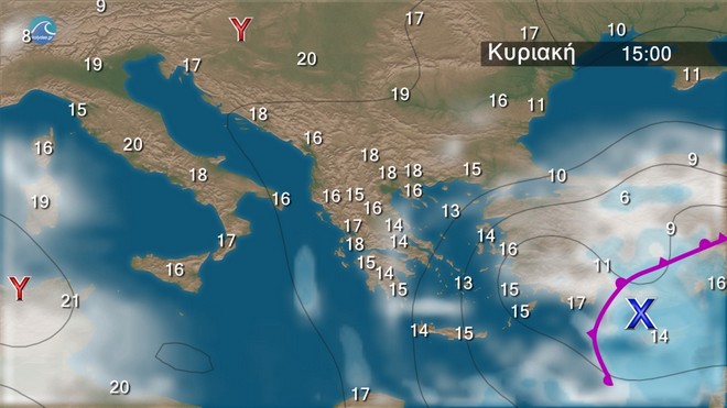 Στον χάρτη της Βαλκανικής που ακολουθεί παρατηρούμε ότι το χαμηλό έχει περάσει στα νοτιοανατολικά. Έτσι την Κυριακή σε όλη τη χώρα προβλέπονται λίγες νεφώσεις παροδικά αυξημένες στα ανατολικά και τα νότια με τοπικές βροχές στην Κρήτη. Οι άνεμοι θα πνέουν από βόρειες διευθύνσεις στα δυτικά 4 με 5, στα ανατολικά 6 με 7 και στο Αιγαίο τοπικά 8 μποφόρ με βαθμιαία εξασθένηση από το απόγευμα. Η θερμοκρασία θα παρουσιάσει μικρή άνοδο και θα φτάσει τους 19 βαθμούς στα δυτικά και τα βόρεια, στα ανατολικά ηπειρωτικά τους 15 και στα νησιά του Αιγαίου τους 14 με 17 βαθμούς Κελσίου.