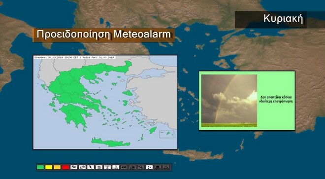 Βελτιωμένος καιρός θα επικρατήσει την Κυριακή σε όλη σχεδόν τη χώρα και μόνο στα νότια θα εκδηλωθούν ασθενείς βροχές. Οι άνεμοι θα παρουσιάσουν προοδευτική εξασθένηση αν και νωρίς το πρωί θα φτάνουν τα 8 μπ στο κεντρικό και νότιο Αιγαίο.