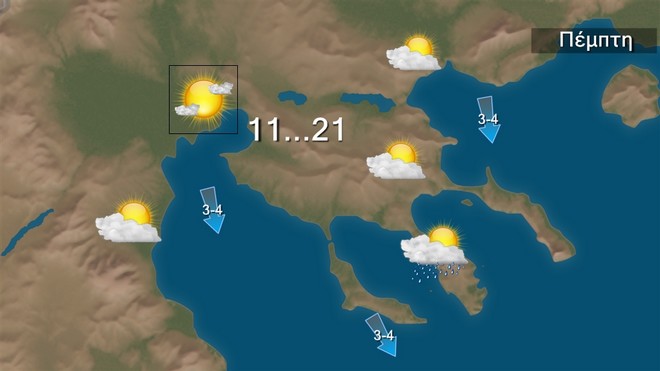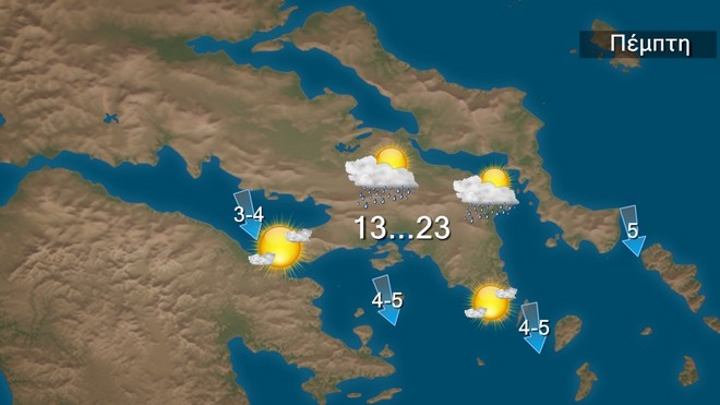 Την Πέμπτη στο Ιόνιο και τη δυτική ηπειρωτική χώρα, προβλέπεται γενικά αίθριος καιρός με πρόσκαιρες τοπικές νεφώσεις. Στην υπόλοιπη χώρα θα υπάρχουν νεφώσεις με βροχές και καταιγίδες κατά τόπους ισχυρές κυρίως στην ανατολική νησιωτική χώρα που βαθμιαία θα εξασθενήσουν. Στα υπόλοιπα τμήματα θα εκδηλωθούν παροδικές μπόρες που θα σταματήσουν από το απόγευμα . Οι άνεμοι θα πνέουν στο Ιόνιο και τα ηπειρωτικά από βόρειες διευθύνσεις 4 με 6 μποφόρ. Στα υπόλοιπα νωρίς το πρωί θα είναι ΝΔ που βαθμιαία θα στραφούν σε βοριάδες 4 με 5 μποφόρ. Η θερμοκρασία δεν θα σημειώσει αξιόλογη μεταβολή και θα έχει μέγιστη τιμή στα βόρεια τους 21 βαθμούς, στα υπόλοιπα ηπειρωτικά και το Ιόνιο τους 22 με 23 βαθμούς Κελσίου, στις Κυκλάδες και την Κρήτη τους 23 βαθμούς και στο Ανατολικό Αιγαίο και τα Δωδεκάνησα τους 24 βαθμούς Κελσίου.