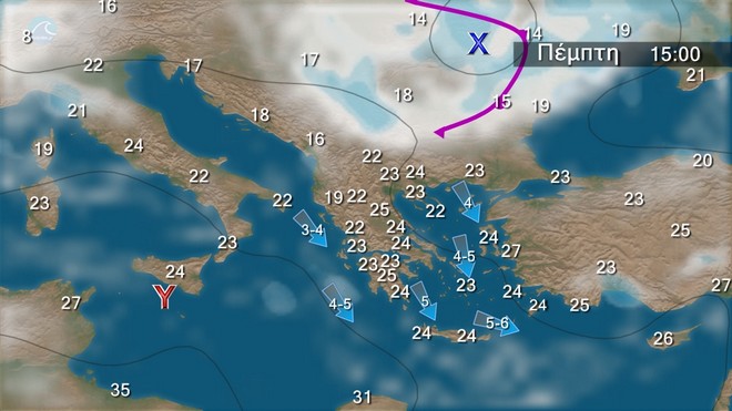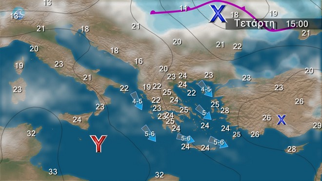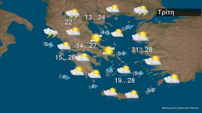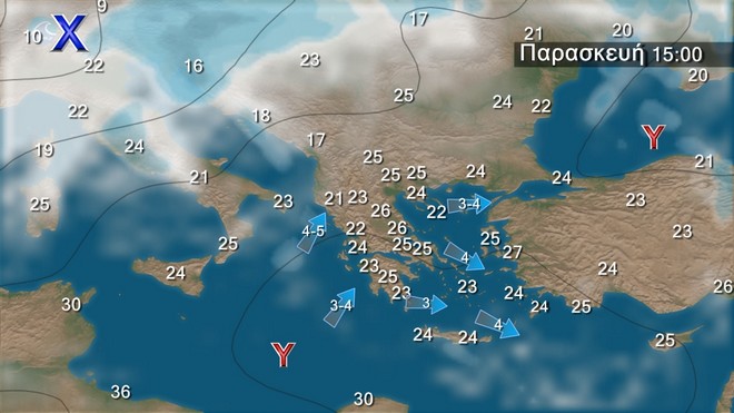 Στα δυτικά, τα κεντρικά, τα βόρεια και τα νησιά του βορείου και ανατολικού Αιγαίου προβλέπονται νεφώσεις με βροχές και σποραδικές καταιγίδες πιθανώς κατά τόπους ισχυρές τις πρωινές ώρες στη Θράκη και τα νησιά βορειοανατολικού Αιγαίου. Στην υπόλοιπη χώρα λίγες νεφώσεις παροδικά αυξημένες με πρόσκαιρους όμβρους ή μεμονωμένες καταιγίδες, κυρίως τις πρωινές ώρες στην Κρήτη και τις Κυκλάδες και από το μεσημέρι στα Δωδεκάνησα. Τα φαινόμενα από το απόγευμα και από τα δυτικά θα παρουσιάσουν βαθμιαία εξασθένηση. Οι άνεμοι θα πνέουν από δυτικές διευθύνσεις 4 με 6 μποφόρ και βαθμιαία από τα δυτικά δυτικοί βορειοδυτικοί με την ίδια ένταση. Η θερμοκρασία θα σημειώσει μικρή πτώση στα δυτικά..