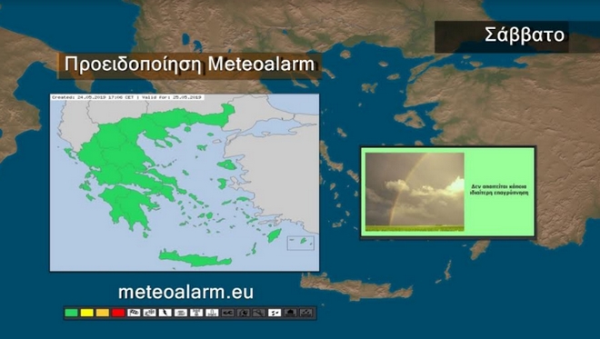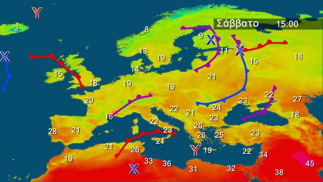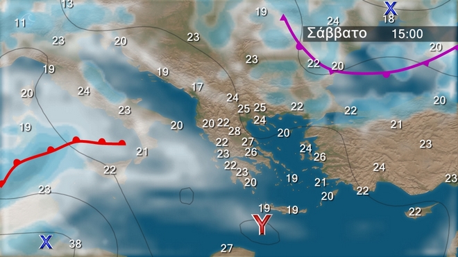 Στον χάρτη της Βαλκανικής διακρίνεται καλύτερα το ομαλό βαρομετρικό πεδίο που επικρατεί πάνω από την χώρα μας. Έτσι το Σάββατο θα επικρατήσει γενικά αίθριος καιρός. Τις μεσημβρινές και απογευματινές ώρες στα ηπειρωτικά θα αναπτυχθούν πρόσκαιρες νεφώσεις και στα βόρεια ορεινά, κυρίως της ανατολικής Μακεδονίας και της Θράκης, θα εκδηλωθούν τοπικοί όμβροι. Οι άνεμοι θα πνέουν από δυτικές διευθύνσεις 3 με 5, που βαθμιαία στα κεντρικά και βόρεια της ανατολικής χώρας θα στραφούν σε νότιους 3 με 4 μποφόρ. Η θερμοκρασία θα σημειώσει άνοδο και θα φτάσει στα βόρεια τους 23 με 27 βαθμούς, στα υπόλοιπα ηπειρωτικά και το Ιόνιο τους 26 με 30 βαθμούς και στα νησιά του Αιγαίου τους 26 με 28 βαθμούς Κελσίου.