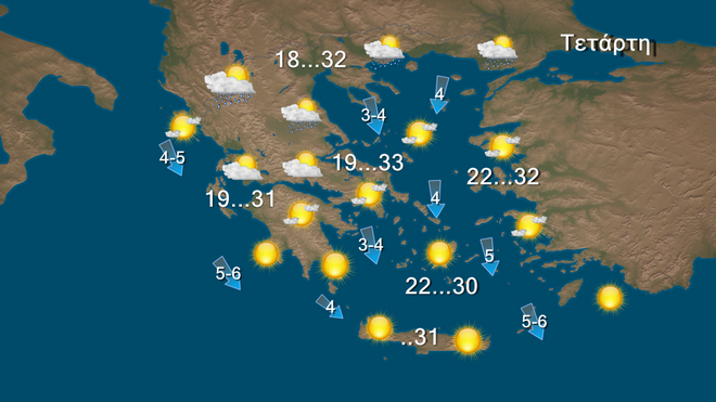 Γενικά αίθριος θα είναι ο καιρός σήμερα, Τετάρτη. Τοπικοί όμβροι τις απογευματινές ώρες στα ηπειρωτικά ορεινά. Άνεμοι βόρειοι βορειοδυτικοί 3 με 5 και στο Αιγαίο τοπικά 6 μποφόρ. Θερμοκρασία σε μικρή άνοδο.