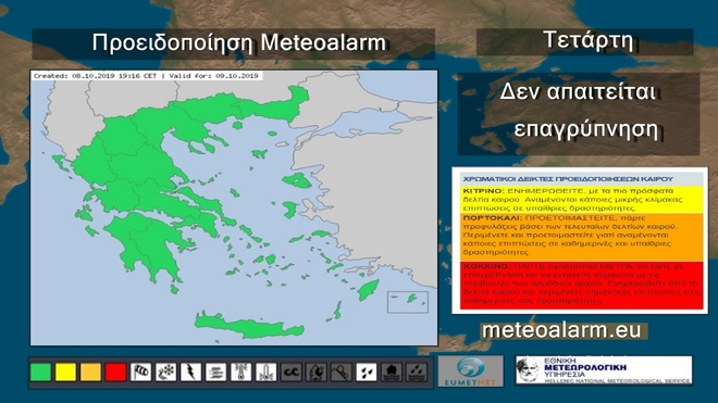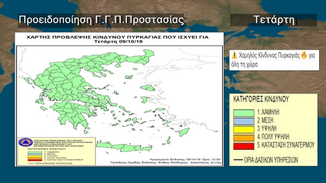Από πλευράς επικινδυνότητας πυρκαγιών θα έχουμε Χαμηλό κίνδυνο Πυρκαγιάς για όλη τη χώρα σύμφωνα με την πρόβλεψη της Γενικής Γραμματείας Πολιτικής Προστασίας.