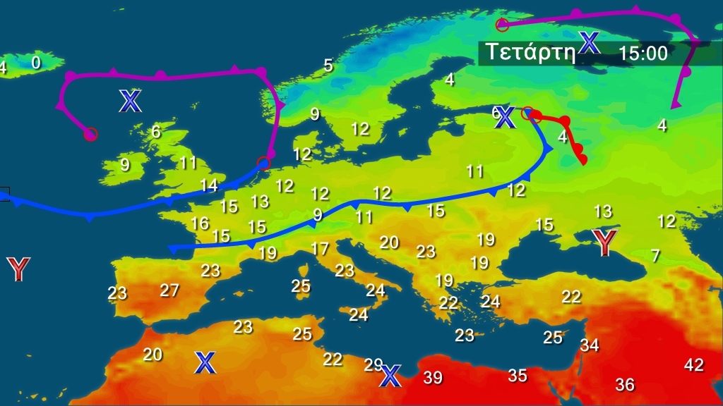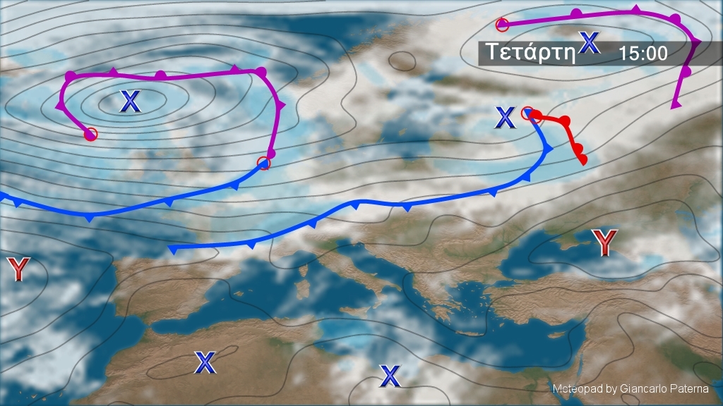 Στον γενικό χάρτη της Ευρώπης διακρίνονται ισχυρά βαρομετρικά χαμηλά στα δυτικά και ανατολικά τμήματα της Ευρώπης . Το βαρομετρικό χαμηλό που μας επηρέασε έχει κινηθεί νότια ενώ από την περιοχή μας απομακρύνονται οι ασταθείς αέριες μάζες.