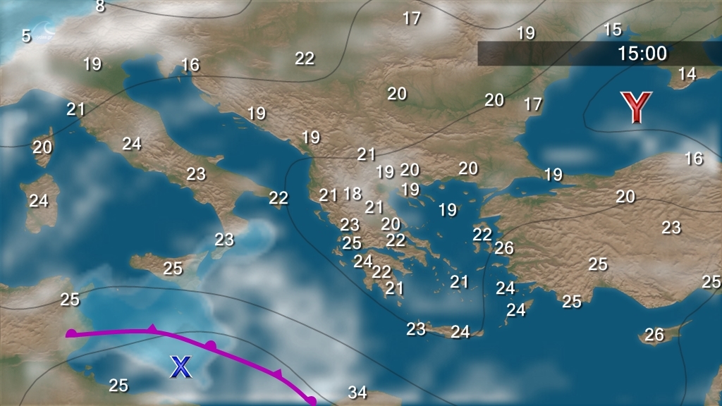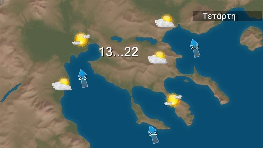Την Τετάρτη προβλέπονται λίγες νεφώσεις παροδικά αυξημένες μέχρι το μεσημέρι στην κεντρική Μακεδονία, τη Θεσσαλία, τις Σποράδες, την ανατολική Στερεά, την Εύβοια, την ανατολική Πελοπόννησο και την Κρήτη, όπου θα σημειωθούν τοπικές βροχές γενικά ασθενείς, αλλά ο καιρός αργότερα θα βελτιωθεί . Τοπικά περιορισμένη ορατότητα στα ηπειρωτικά τις πρωινές και βραδινές ώρες. Οι άνεμοι θα πνέουν στα δυτικά ανατολικοί νοτιοανατολικοί 3 με 5 και στο Ιόνιο τοπικά 6 μποφόρ. Στα ανατολικά από βόρειες διευθύνσεις 3 με 5 και στο Αιγαίο τοπικά 6 μποφόρ. Η θερμοκρασία στα βόρεια δεν θα ξεπεράσει τους 22 βαθμούς, στα υπόλοιπα ηπειρωτικά θα φτάσει τους 25 με 27 και στα νησιά τους 25 με 27 βαθμούς Κελσίου.
