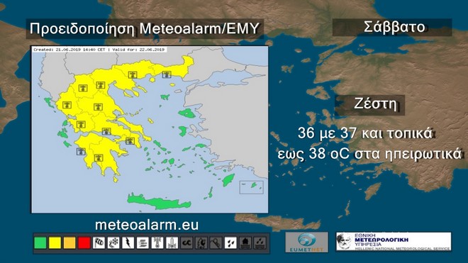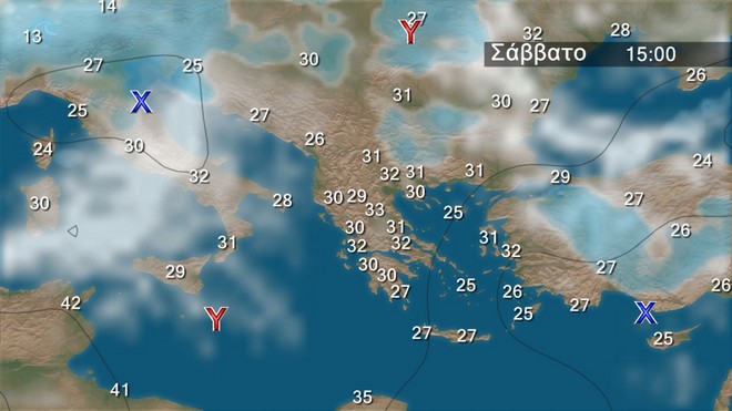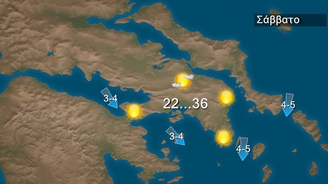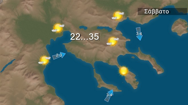 Το Σάββατο προβλέπεται γενικά αίθριος καιρός. Πρόσκαιρες νεφώσεις θα αναπτυχθούν τις απογευματινές ώρες στα ηπειρωτικά όπου είναι πιθανό να εκδηλωθούν τοπικοί όμβροι στα ορεινά. Οι άνεμοι θα πνέουν βόρειοι βορειοδυτικοί 3 με 5 και στο Αιγαίο τοπικά 6 μποφόρ. Η θερμοκρασία θα σημειώσει μικρή άνοδο και θα φτάσει στα ηπειρωτικά τους 36 με 37 και τοπικά τους 38 βαθμούς Κελσίου. και στα νησιά του Αιγαίου τους 31 με 33 βαθμούς Κελσίου.
