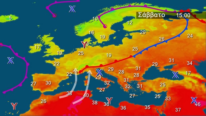 Στον γενικό χάρτη της Ευρώπης διακρίνονται τα βαρομετρικά χαμηλά που επηρεάζουν τη βόρεια Ευρώπη. Από τις ακτές της Αφρικής ξεκινά θερμή εισβολή προς την Κεντρική Μεσόγειο και την περιοχή μας.