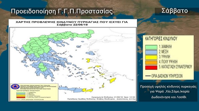 Τοπικά υψηλή κατηγορία κινδύνου για πυρκαγιές στα Ψαρά, τη Χίο ,τη Σάμο την Ικαρία τα Δωδεκάνησα και το Λασίθι σύμφωνα με την πρόγνωση της Γενικής Γραμματείας Πολιτικής Προστασίας.