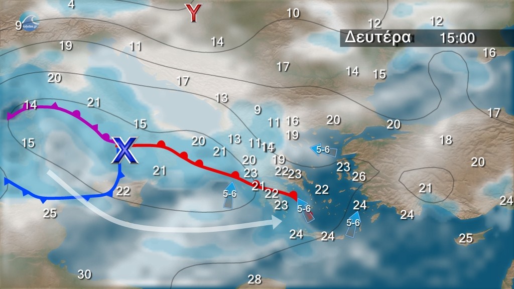 Νεφώσεις με βροχές και σποραδικές καταιγίδες, πιθανώς κατά τόπους ισχυρές στα δυτικά, τα νησιά του ανατολικού Αιγαίου και τα Δωδεκάνησα, με σταδιακή εξασθένηση από τα δυτικά και από το απόγευμα. Οι άνεμοι θα πνέουν στα κεντρικά και νότια από νότιες διευθύνσεις 4 με 6 και στα πελάγη πρόσκαιρα τοπικά 7 μποφόρ. Στα υπόλοιπα ανατολικοί βορειοανατολικοί 4 με 6 και στο βόρειο Αιγαίο τοπικά 7 μποφόρ. Η θερμοκρασία δεν θα σημειώσει αξιόλογη μεταβολή.