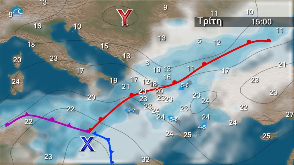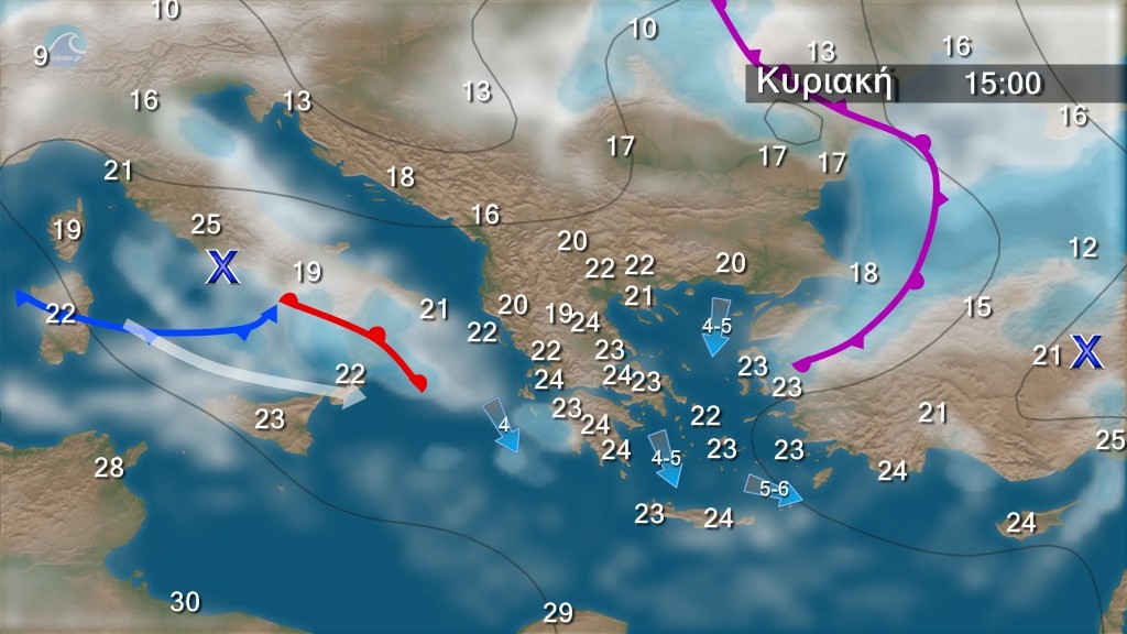 Στο Ιόνιο και τα ηπειρωτικά, πλην ανατολικής Μακεδονίας και Θράκης, νεφώσεις με τοπικές βροχές και σταδιακά σποραδικές καταιγίδες, που μετά το μεσημέρι θα επεκταθούν και στις υπόλοιπες περιοχές. Τα φαινόμενα θα είναι πιθανώς κατά τόπους ισχυρά στα δυτικά, κεντρικά και βόρεια, και από το βράδυ στα νησιά του ανατολικού Αιγαίου. Οι άνεμοι θα πνέουν, στα νότια νοτιοδυτικοί 4 με 5 και από το μεσημέρι 6 μποφόρ. Στα υπόλοιπα από ανατολικές διευθύνσεις 4 με 6, ενισχυόμενοι από το βράδυ στο βόρειο Αιγαίο σε 7 μποφόρ. Η θερμοκρασία θα σημειώσει πτώση στα κεντρικά και βόρεια ως προς τις μέγιστες τιμές της.