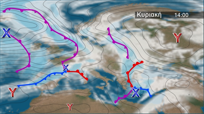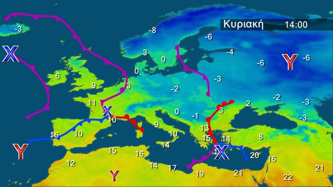 Στον χάρτη των βαρομετρικών συστημάτων της Ευρώπης παρατηρούμε το χαμηλό που θα μας επηρεάσει, καθώς και το άλλο σύστημα που βρίσκεται στη δυτική Μεσόγειο και θα κινηθεί κι αυτό ανατολικά.