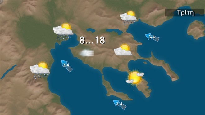 Την Τρίτη τοπικές βροχές θα εκδηλωθούν στο Ιόνιο και τα ηπειρωτικά, εκτός της ανατολικής Μακεδονίας και της Θράκης. Σποραδικές καταιγίδες θα εκδηλωθούν κυρίως στο βόρειο Ιόνιο, όπου πιθανώς τα φαινόμενα να είναι κατά τόπους έντονα. Στην υπόλοιπη χώρα λίγες νεφώσεις και αρκετή ηλιοφάνεια. Τοπικές ομίχλες θα σημειωθούν στα ηπειρωτικά τις πρωινές ώρες. Οι άνεμοι θα πνέουν στο Ιόνιο και τα ηπειρωτικά από νότιες διευθύνσεις 4 με 5, στο Ιόνιο 6 και στα βόρεια έως 7 μποφόρ. Η θερμοκρασία θα έχει μέγιστη τιμή στα βόρεια τους 18 βαθμούς, στα υπόλοιπα ηπειρωτικά και το Ιόνιο τους 21 βαθμούς Κελσίου, στις Κυκλάδες και την Κρήτη τους 20 βαθμούς και στο Ανατολικό Αιγαίο και τα Δωδεκάνησα τους 22 βαθμούς Κελσίου.