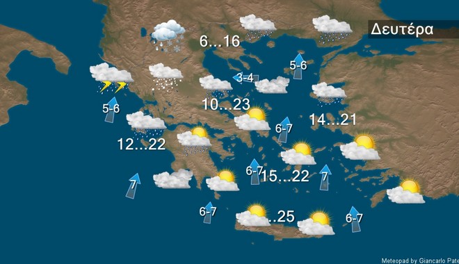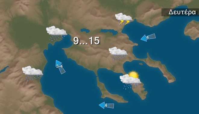 Τη Δευτέρα προβλέπονται βροχές στο Ιόνιο, την Ήπειρο, τη δυτική Στερεά, τη Μακεδονία, τη Θράκη, την ανατολική νησιωτική χώρα και πρόσκαιρα στη Θεσσαλία και τις Σποράδες, ενώ σποραδικές καταιγίδες θα εκδηλωθούν κυρίως στα βορειοδυτικά. Χιόνια θα πέσουν στα βόρεια ορεινά.