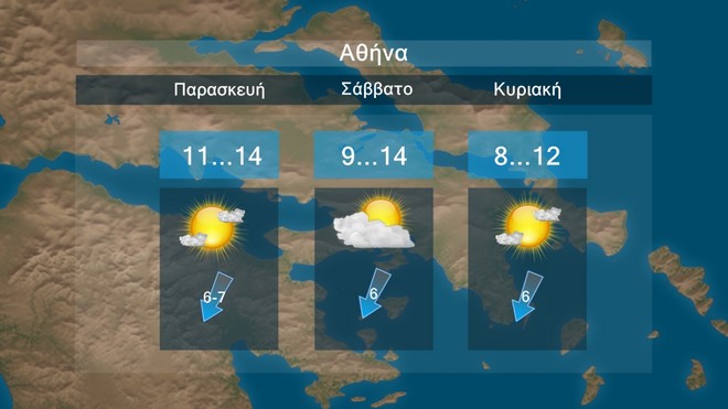 Στην Αθήνα προβλέπονται νεφώσεις παροδικά αυξημένες . Η θερμοκρασία θα έχει μέγιστες τιμές περί τους 12 με 14 βαθμούς Κελσίου τιμές περίπου 3-5 βαθμούς κάτω από τα κανονικά επίπεδα.