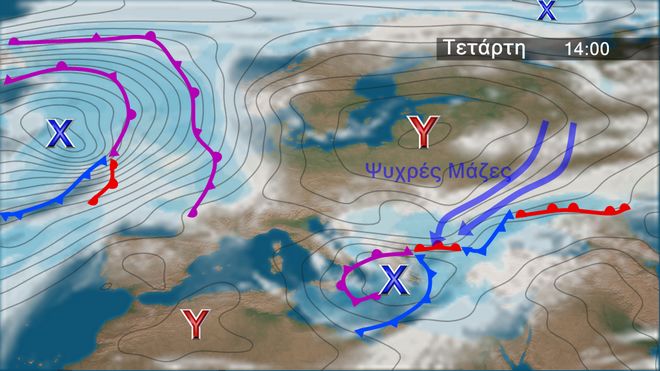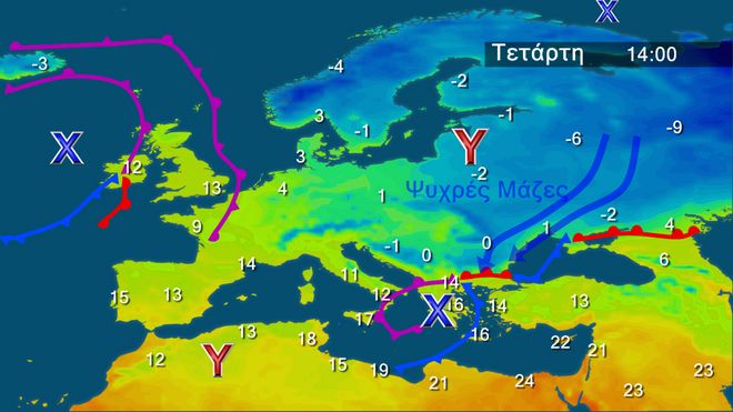 Στον χάρτη των βαρομετρικών συστημάτων της Ευρώπης παρατηρούμε ότι στη χώρα οργανώνεται το βαρομετρικό χαμηλό το οποίο κινείται ανατολικά και προκαλεί εκτός από τα φαινόμενα, έντονη ψυχρή μεταφορά από την ανατολική Ευρώπη η οποία μέχρι το βράδυ θα γίνει αισθητή στη βόρεια Ελλάδα.