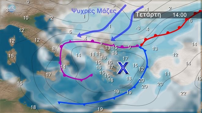 Το βαρομετρικό χαμηλό της από το μεσημέρι εισέρχεται στο Αιγαίο και θα προκαλέσει έντονα φαινόμενα όχι μόνο στα δυτικά αλλά στο Ανατολικό Αιγαίο και τα Δωδεκάνησα, ενώ παράλληλα θα γυρίσει τους ανέμου σε βοριάδες στη Βόρεια Ελλάδα και κυρίως στη Θράκη οι οποίοι τοπικά προς το βράδυ θα φτάσουν τα 6 με 7 μποφόρ και η θερμοκρασία θα φτάσει στα βόρεια τους 16 βαθμούς με σημαντική πτώση από το απόγευμα και στις υπόλοιπες περιοχές τους 17 με 19 βαθμούς Κελσίου.
