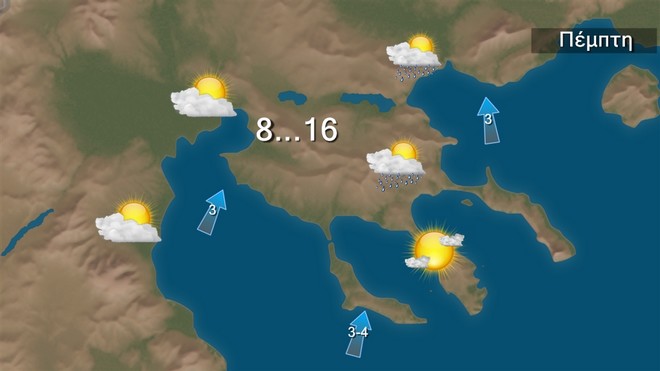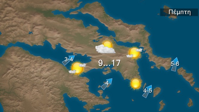 Την Πέμπτη τοπικές βροχές προβλέπονται στα δυτικά, τα βόρεια και πιθανώς στα κεντρικά και τα νησιά του ανατολικού Αιγαίου, ενώ μεμονωμένες καταιγίδες θα εκδηλωθούν στα βορειοδυτικά και λίγα χιόνια στα βορειοδυτικά ορεινά. Στην υπόλοιπη χώρα θα υπάρχουν λίγες νεφώσεις κατά διαστήματα αυξημένες. Οι άνεμοι θα πνέουν νότιοι νοτιοδυτικοί 4 με 6 μποφόρ. Η θερμοκρασία θα σημειώσει μικρή άνοδο κυρίως στα νότια και θα έχει μέγιστη τιμή στα βόρεια τους 16 βαθμούς, στα υπόλοιπα ηπειρωτικά και το Ιόνιο τους 17 με 18 βαθμούς Κελσίου, στις Κυκλάδες και την Κρήτη τους 19 βαθμούς και στο Ανατολικό Αιγαίο και τα Δωδεκάνησα τους 19 βαθμούς Κελσίου.