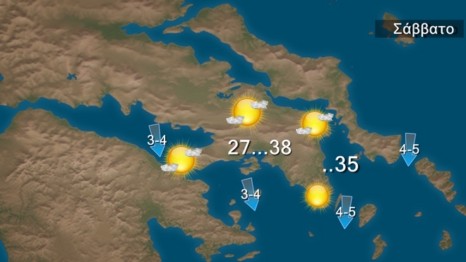 Η θερμοκρασία θα φτάσει και τους 39 βαθμούς Κελσίου. Στις νησιωτικές και τις παραθαλάσσιες περιοχές η μέγιστη θερμοκρασία θα είναι με 5 βαθμούς χαμηλότερη. Από τα βόρεια πτώση της θερμοκρασίας.
