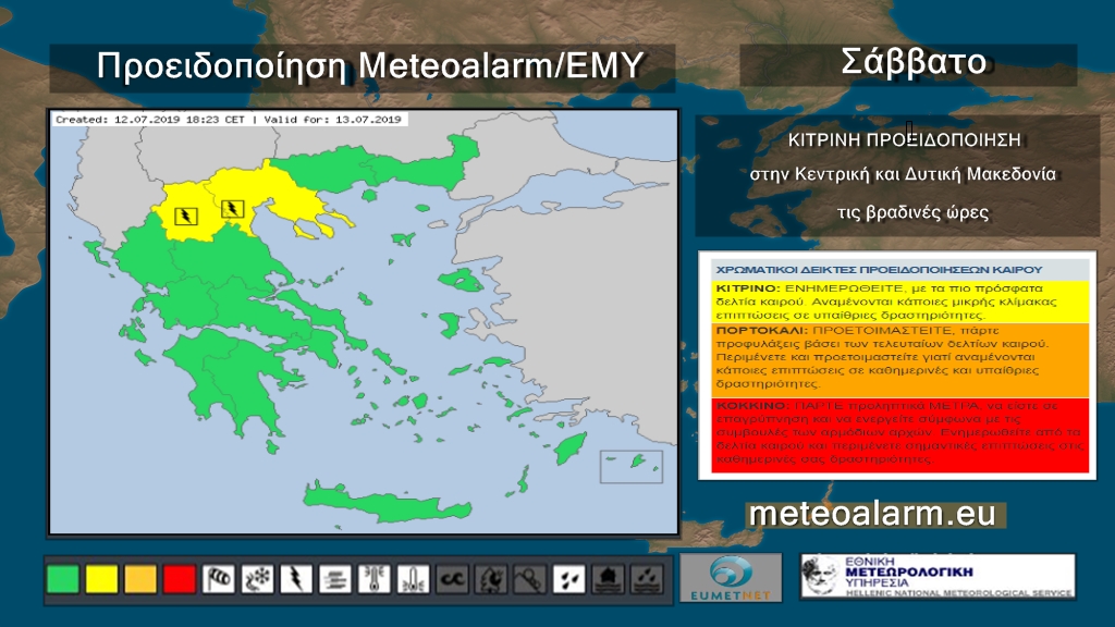 Οι περιοχές που θα επηρεαστούν αρχικά θα είναι το βόρειο Ιόνιο, η Ήπειρος και πιθανόν η δυτική Στερεά, ενώ από τα μεσάνυχτα μέχρι και τις μεσημβρινές ώρες της Κυριακής η Μακεδονία (κυρίως η κεντρική και ανατολική Μακεδονία), τα βόρεια τμήματα της Θεσσαλίας, οι βόρειες Σποράδες καθώς και τα νησιά του βορείου Αιγαίου. Για το Σάββατο κίτρινη προειδοποίηση σε δυτική και κεντρική Μακεδονία.