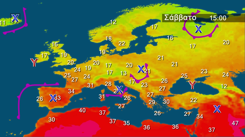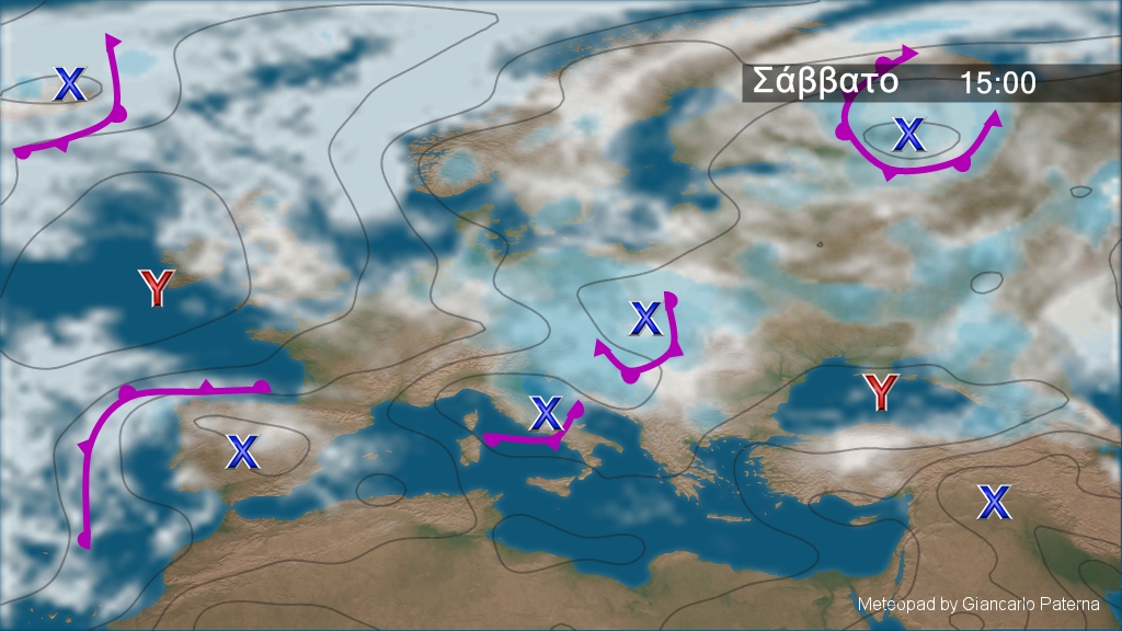 Στον γενικό χάρτη της Ευρώπης διακρίνονται τα χαμηλά που επηρεάζουν τη Βόρεια Ευρώπη στα βορειοδυτικά και τα βορειοανατολικά τμήματα. Το χαμηλό που θα μας επηρεάσει βρίσκεται στην Ιταλία.