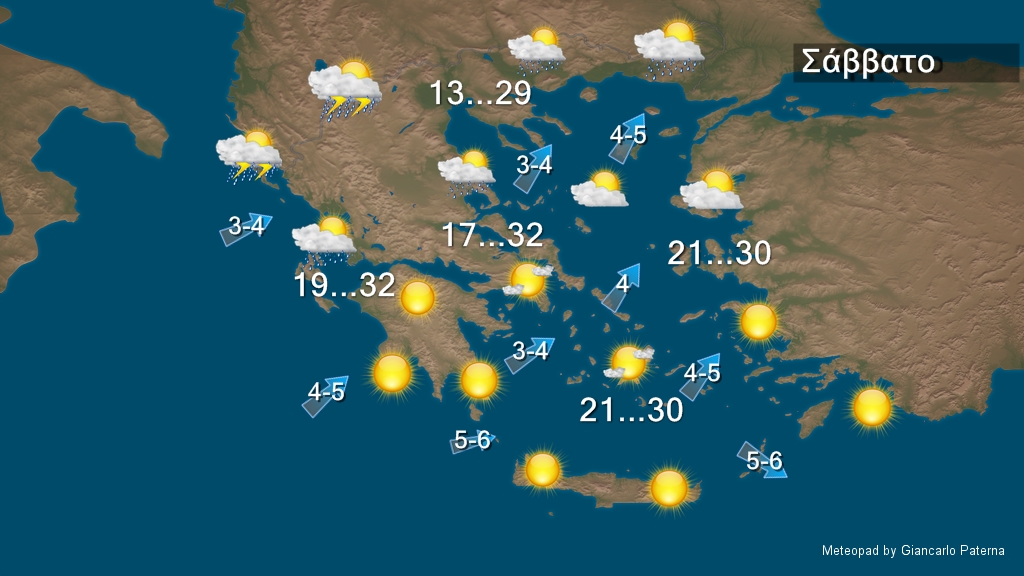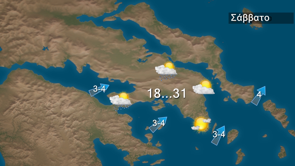 Το Σάββατο στο Ιόνιο, τα ηπειρωτικά και το βόρειο Αιγαίο προβλέπονται λίγες νεφώσεις παροδικά αυξημένες με τοπικές βροχές και στα βόρεια τις μεσημβρινές και απογευματινές ώρες σποραδικές καταιγίδες. Από τις βραδινές ώρες θα έχουμε περισσότερα φαινόμενα στο Βόρειο Ιόνιο την ‘Ήπειρο και τη δυτική Στερεά ,ενώ αργότερα θα επηρεαστεί η Μακεδονία . Στις υπόλοιπες περιοχές γενικά αίθριος καιρός. Οι άνεμοι στα δυτικά, τα κεντρικά και τα βόρεια νοτιοδυτικοί μέτριοι στις υπόλοιπες περιοχές δυτικοί βορειοδυτικοί 4 με 5 και στα Δωδεκάνησα τοπικά έως 6 μποφόρ. Η θερμοκρασία δεν θα παρουσιάσει αξιόλογη μεταβολή θα έχει μέγιστες τιμές περί τους 29 με 32 βαθμούς Κελσίου.