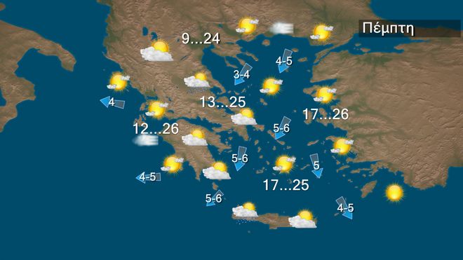 Σήμερα, Πέμπτη, ο καιρός προβλέπεται σχεδόν αίθριος σε όλη τη χώρα με λίγες νεφώσεις και μικρή πιθανότητα λίγων βροχών στα ηπειρωτικά.
