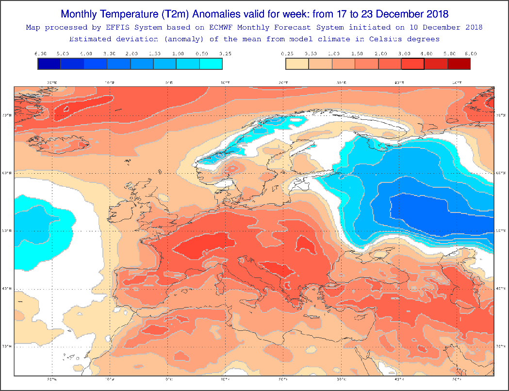 Οι τιμές της θερμοκρασίας στη περιοχή μας θα είναι κατά μέσο όρο 1,5 με 2 βαθμούς πάνω από τη μέση κλιματική τιμή όπως προκύπτει και από το κλιματικό μοντέλο του Ευρωπαϊκού Κέντρου Μεσοπρόθεσμων Προγνώσεων (ECMWF) . Το ίδιο θα ισχύει για όλη σχεδόν την Ευρώπη.