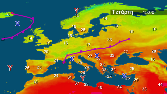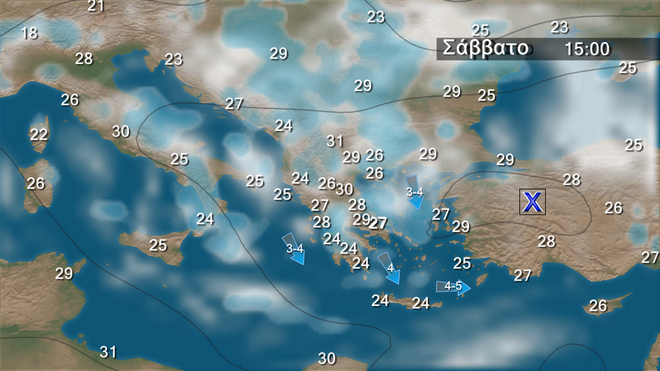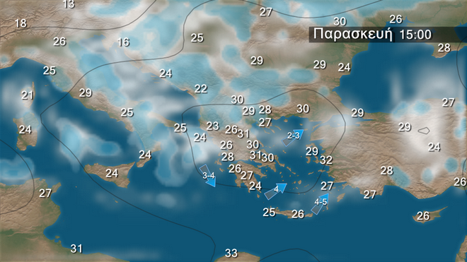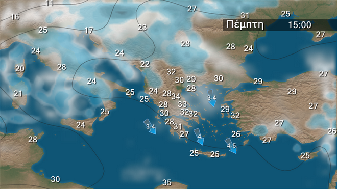Σήμερα, στις νησιωτικές περιοχές του Αιγαίου θα ξεπεράσουμε τους 31 βαθμούς , ενώ στα υπόλοιπα ηπειρωτικά και το Ιόνιο θα φτάσουμε τοπικά και τους 35 με 36 βαθμούς Κελσίου.