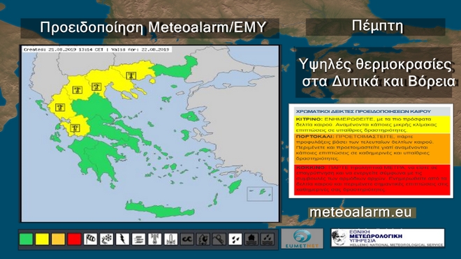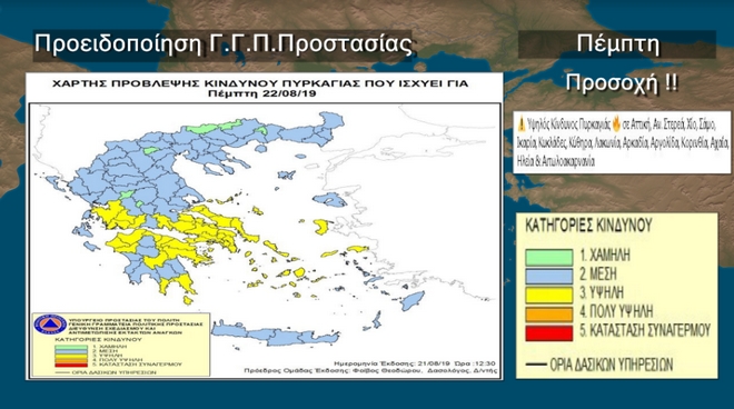 Από πλευράς επικινδυνότητας πυρκαγιών την Πέμπτη θα έχουμε Υψηλό Κίνδυνο Πυρκαγιάς σε Αττική, Αν. Στερεά, Χίο, Σάμο, Ικαρία, Κυκλάδες, Κύθηρα, Λακωνία, Αρκαδία, Αργολίδα, Κορινθία, Αχαΐα, Ηλεία & Αιτωλοακαρνανία, σύμφωνα με την πρόβλεψη της Γενικής Γραμματείας Πολιτικής Προστασίας.