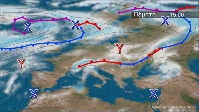 Στον χάρτη της Βαλκανικής διακρίνεται καλύτερα ο συνδυασμός των υψηλών πιέσεων στα βόρεια Βαλκάνια με τις χαμηλές στην περιοχή της Κύπρου.