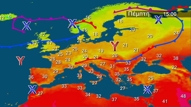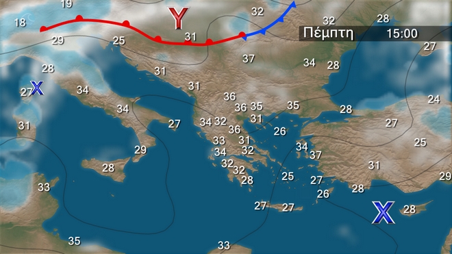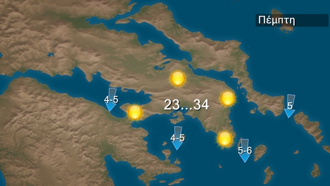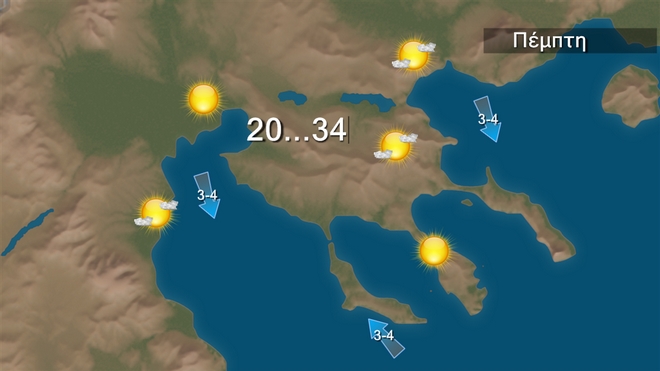 Την Πέμπτη προβλέπεται γενικά αίθριος. Τις μεσημβρινές και απογευματινές ώρες θα αναπτυχθούν τοπικές νεφώσεις στα ορεινά της Ηπείρου και της Μακεδονίας. Οι άνεμοι θα πνέουν από βόρειες διευθύνσεις στα δυτικά 3 με 5, στα ανατολικά 5 με 6 και στο Αιγαίο κατά τη διάρκεια της ημέρας τοπικά 7 μποφόρ. Η θερμοκρασία θα σημειώσει μικρή άνοδο στο Ιόνιο και τα ηπειρωτικά και θα φτάσει στα ηπειρωτικά τους 36 με 37 βαθμούς και στο Αιγαίο τους 30 με 34 βαθμούς Κελσίου.