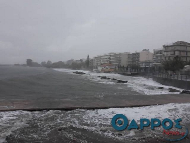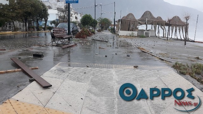 Στην παραλία της Καλαμάτας τα κύματα έχουν ανέβει και στον παρακείμενο κεντρικό δρόμο και ήδη πολλά τραπεζοκαθίσματα και ομπρέλες έχουν παρασυρθεί.