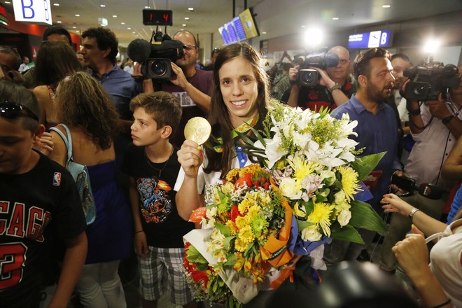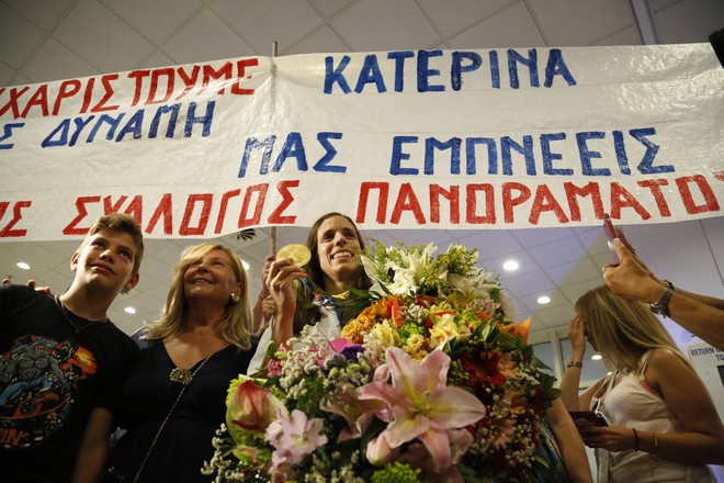 Η αθλήτρια του στίβου που κατάφερε να φτάσει στο πιο ψηλό σκαλί του βάθρου στους Ολυμπιακούς Αγώνες του Ρίο κατέφθασε στην Αθήνα με το χρυσό μετάλλιο στο στήθος. Η Κατερίνα Στεφανίδη που χάρη στην προσπάθειά της ακούστηκε για μία και μόνη φορά ο Εθνικός Ύμνος στο στάδιο, όπου διεξάγονταν τα αγωνίσματα του στίβου. Μαζί της ο προπονητής και σύζυγός της, Μίτσελ Κρίερ και με μια αγκαλιά λουλούδια στα χέρια κράτησε ψηλά το χρυσό μετάλλιο στα φλας των φωτογράφων.