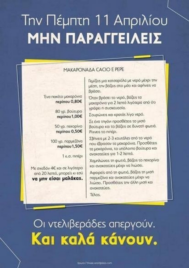 Οι διανομείς φαγητού σε ανακοίνωσή τους μας ενημερώνουν για την προγραμματισμένη απεργία τους και μας καλούν να μην παραγγείλουμε και να φτιάξουμε μία ωραία μακαρονάδα.