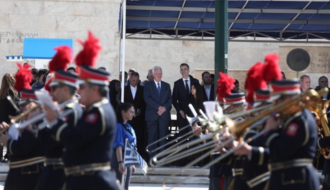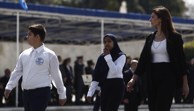 Σε εξέλιξη η μαθητική παρέλαση στο κέντρο της Αθήνας για τους εορτασμούς της 25ης Μαρτίου, παρουσία εκπροσώπων της πολιτικής ηγεσίας της χώρας.