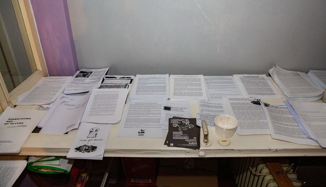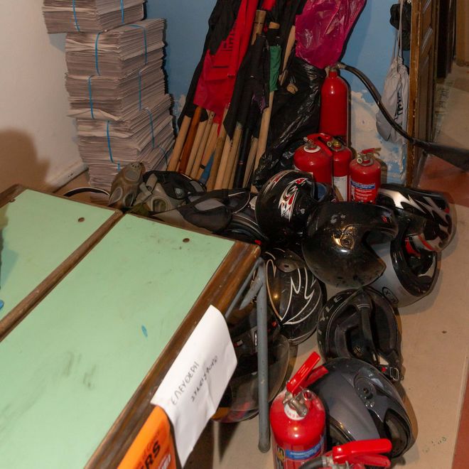 Βρέθηκαν και κατασχέθηκαν κράνη, αντιασφυξιογόνες μάσκες, πυροσβεστήρες, στυλιάρια, ηλεκτρονικός υπολογιστής και έντυπο υλικό