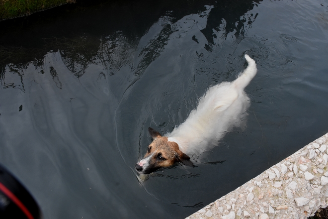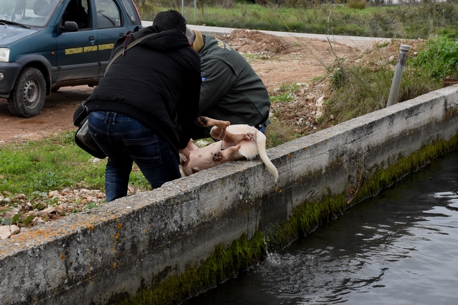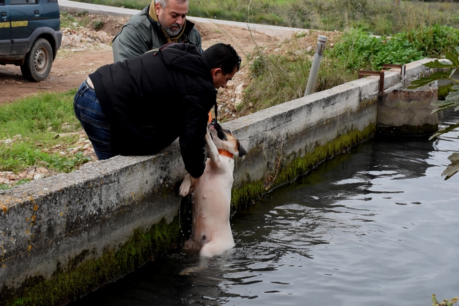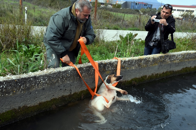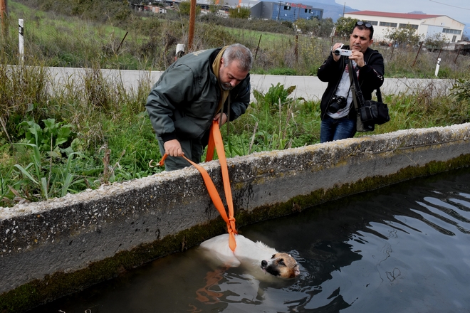 Ο σκύλος εντοπίστηκε μέσα στο νερό από το θηροφύλακα Γιώργο Μαστοράκη που έκανε περιπολία στη περιοχή και με τη βοήθεια του οπερατέρ που έφθασε να καλύψει το γεγονός , κατάφεραν να βγάλουν τον εξουθενωμένο σκύλο από το νερό.