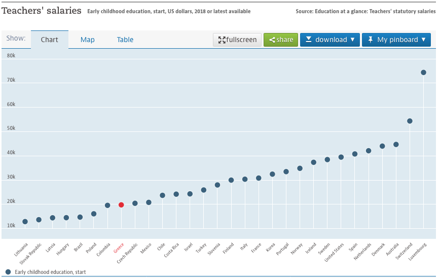 Ένας νηπιαγωγός με 15ετή σταδιοδρομία μπορεί να λαμβάνει ετησίως 26.198 δολάρια ( 23.730 ευρώ) είναι όμως η πέμπτη χειρότερη αμοιβή όταν αντίστοιχα ο νεοδιοριζόμενος έχει την 8η χειρότερη ανάμεσα στους συναδέλφους του. Ο νηπιαγωγός στο Λουξεμβούργο είναι ο μόνος – και με διαφορά – που σπάει το φράγμα των 100 χιλιάδων ( 108.624 δολάρια). Στον αντίποδα στην Λιθουανία η διαφορά με τον πρωτοδιοριζόμενο είναι ελάχιστη (14.200 δολάρια).