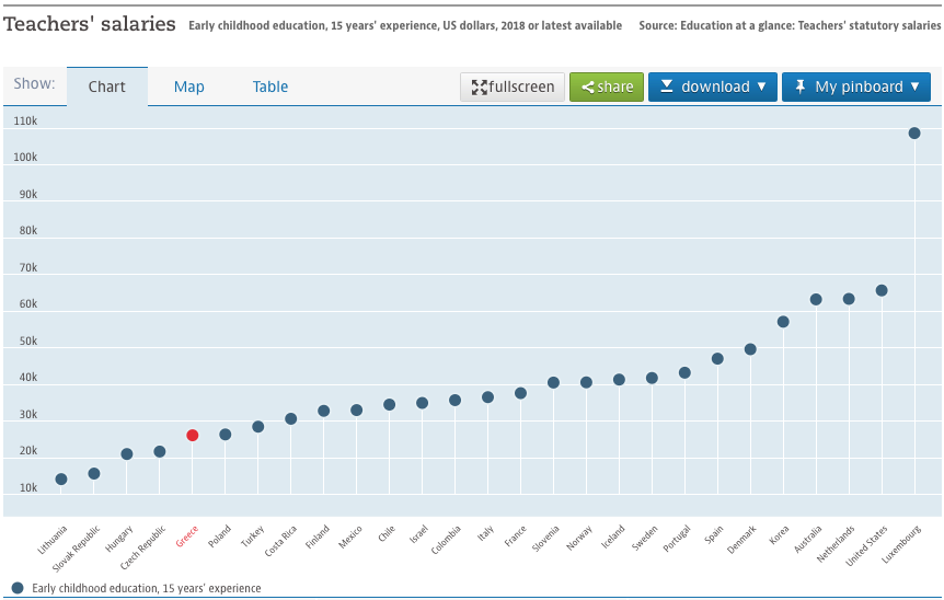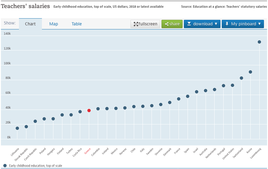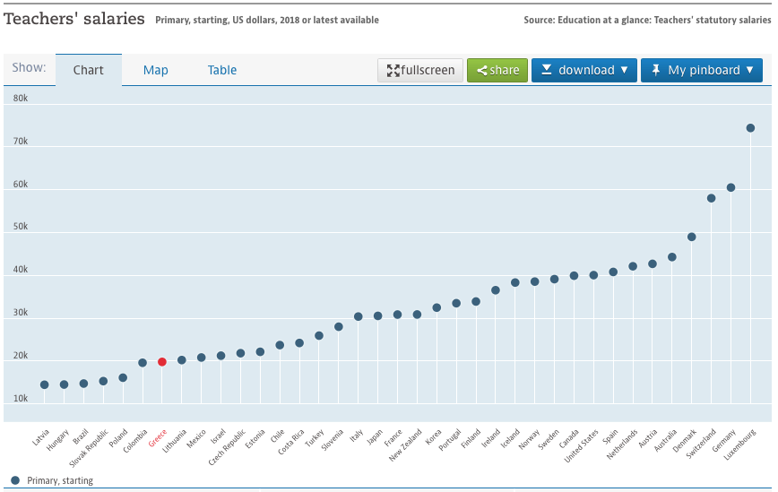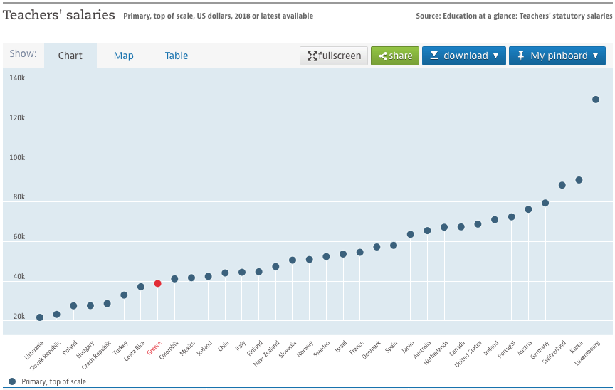 Στο ανώτατο μισθολογικό κλιμάκιο ο Έλληνας δάσκαλος θα φθάσει στα 38.804 δολάρια (35.148 ευρώ) και αφήνει πίσω τον Τούρκο συνάδελφο του (32.953 δολ.) και πλησιάζει σχετικά τους δασκάλους από την Ιρλανδία (42.600) και την Ιταλία ( 44.400 δολ.).