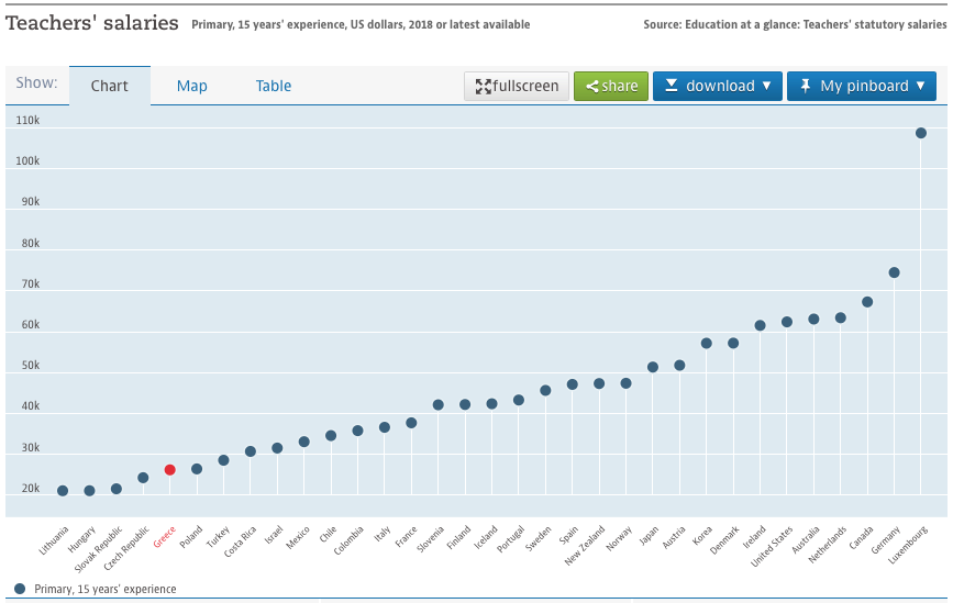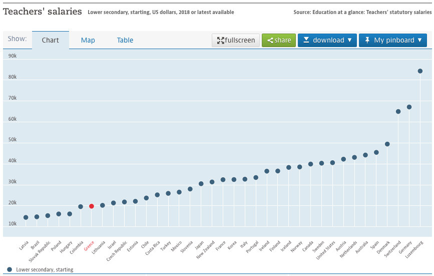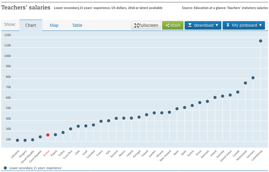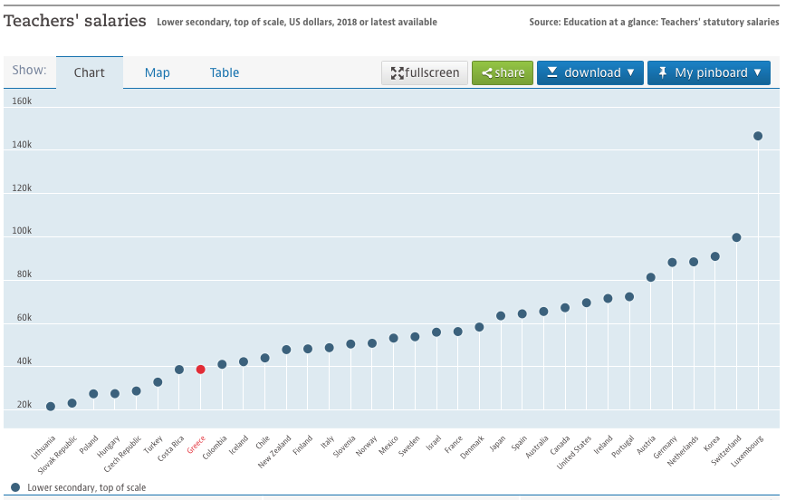 Ο υψηλότερος μισθός καθηγητή στην Ελλάδα (σ.σ. κοινός σε όλες τις βαθμίδες από το νηπιαγωγείο) φθάνει στα 38.804 δολάρια (35.148 ευρώ) και είναι σχεδόν το 1/4 του μισθού του καθηγητή στο Λουξεμβούργο (146.500 δολάρια) που είναι και ο μοναδικός που σπάει το φράγμα των 100.000 δολαρίων.